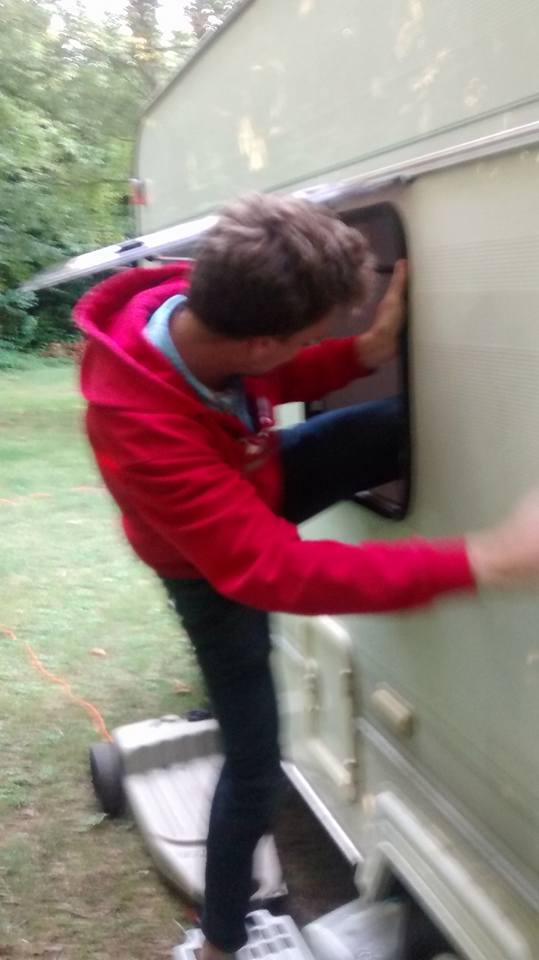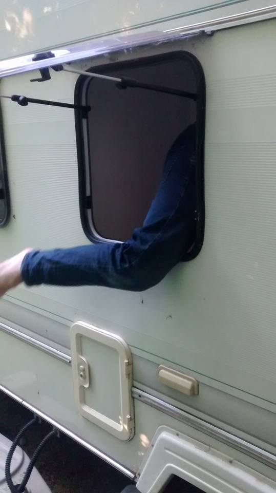 At this point, our friends had finished settling their kids too, and we all stood staring at the caravan, trying to work out how we were going to get in! Fortunately, the window to the ‘bathroom’ (really just a cupboard with a toilet in) was open. This was still quite high up, as you can see from the pictures! It wasn’t easy for Sean to get in and we were all laughing more than helping!